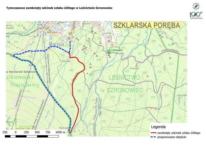 Nadleśnictwo Szklarska Poręba informuje, że do 10 października z powodu prowadzenia prac gospodarczych zamknięty zostaje odcinek żółtego szlaku prowadzącego do Schroniska Pod Łabskim Szczytem w Leśnictwie Szronowiec.