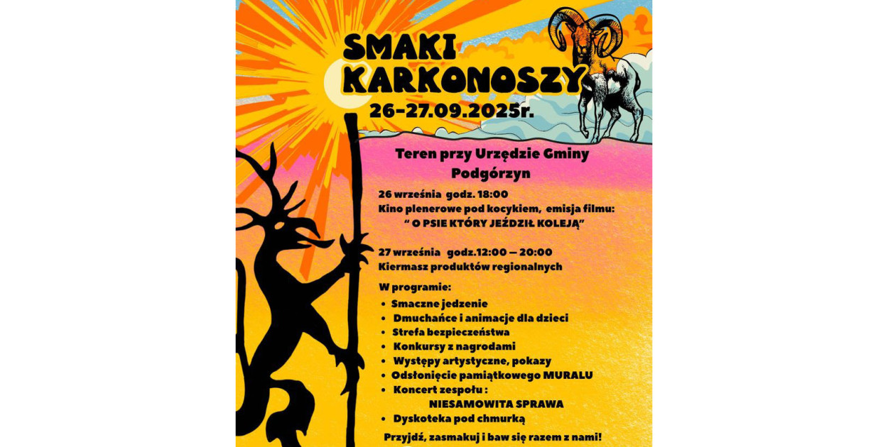 Smaki Karkonoszy w Podgórzynie to święto regionalnych smaków, kultury i rękodzieła, ale także integracji mieszkańców, lokalnych twórców oraz gości z całego regionu. Wydarzenie, które odbędzie się w dniach 26-27.09. podkreśla to, co w Karkonoszach najpiękniejsze: tradycję, pasję i wspólnotę.