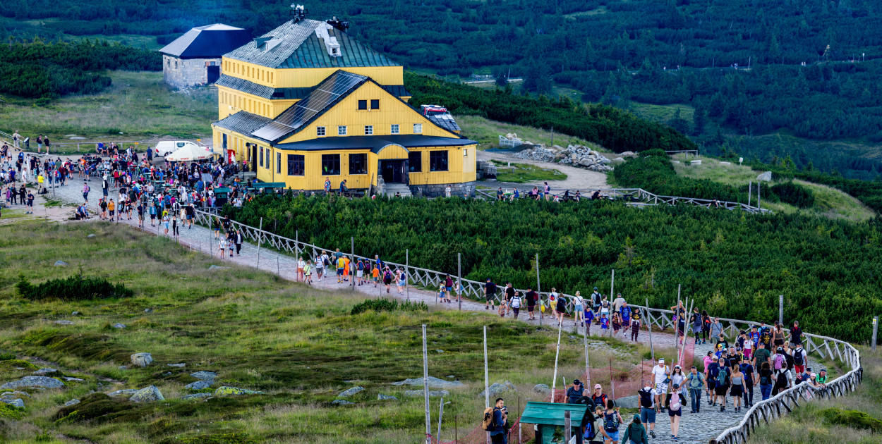 Już od wczesnych godzin porannych parkingi w Karpaczu, przy Świątyni Wang czy w okolicy Białego Jaru wypełniają się po brzegi. Turyści szturmują zarówno klasyczny szlak przez Schronisko Samotnia i Strzechę Akademicką, jak i trasę przez Czarny Grzbiet z Przełęczy Okraj. Kolejka na Kopę również działa pełną parą – szczególnie popularna wśród rodzin z dziećmi i osób starszych.