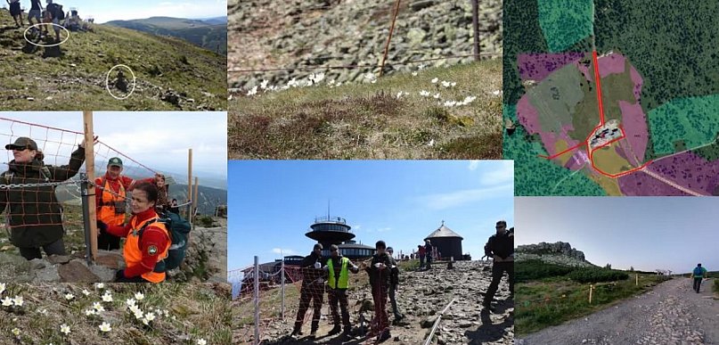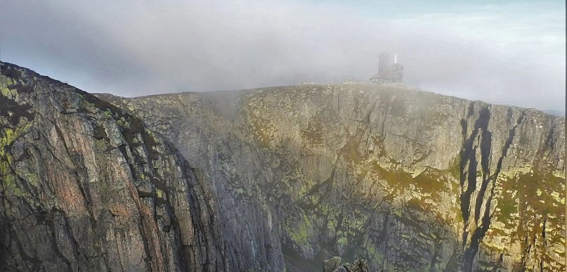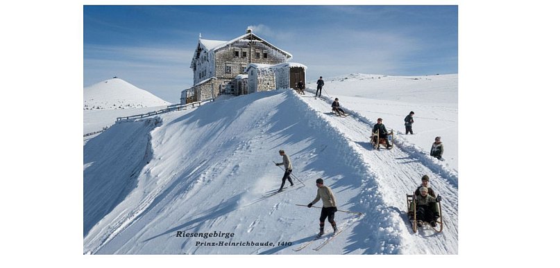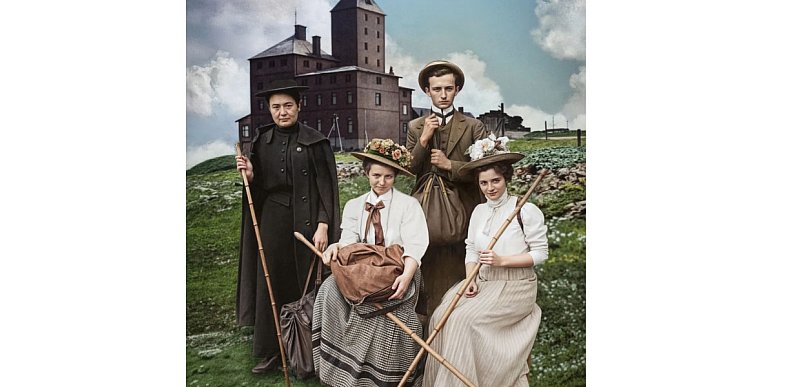 Zdjęcie sprzed ponad wieku na tle monumentalnego schroniska nad Śnieżnymi Kotłami w Karkonoszach. Grupa wędrowców, którzy wybrali się na długą górską wyprawę. Schronisko, dopiero od niedawna wzniesione na grani, uchodzi za jedno z najśmielszych przedsięwzięć w całych Karkonoszach. Turyści, nierzadko z dalekich miast, wspinają się tutaj, by podziwiać nie tylko widoki, ale i nowoczesną budowlę, która miała świadczyć o potędze człowieka wobec dzikiej przyrody.